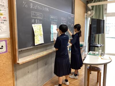本日の葉っぱタイムは各クラスでの活動と、中央委員の生徒は明日の学校祭オリエンテーションの準備をしていました。1年生は、各クラスでレクレーションやプチディベートなどで、絆や集団をつくる「ほっこりタイム」で過ごしていました。