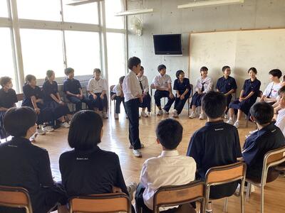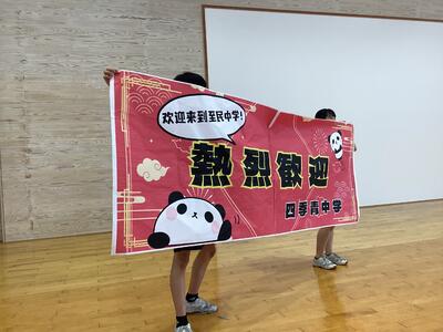 つぎに、全校がアリーナに集まり、ウェルカムセレモニーを行いました。ウエルカムセレモニーでは、吹奏楽部の歓迎演奏の後、四季清中学校の生徒3名のパフォーマンスでダンスと武芸。迫力のある武芸では、歓声や拍手がすごかったです。最後に、中央委員が考えた至民中学校にまつわるクイズで盛り上がりました。