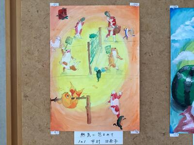 『わたしが描く金魚づくし』ということで、1年生が生徒たちが金魚をモチーフに想像の世界を描いた力作が飾られています。どの絵もとっても工夫されており、じっくりと鑑賞することができます。学校にご来校の際は、どうぞご覧ください。(写真ではうまく伝わらなくて、ごめんなさい。)