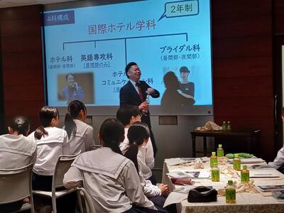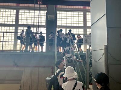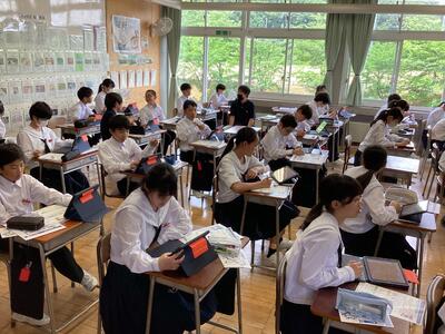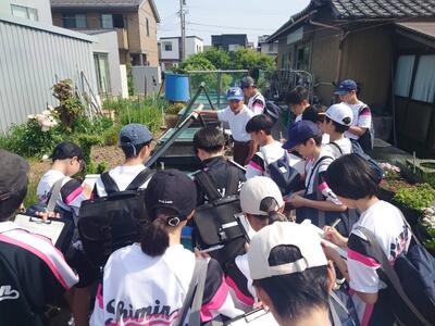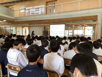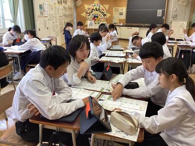 1年生は、公民館の真柄さんから、社南地区には過去の水害に由来して水に関する地名が多いことや、水害に備えてそれぞれの家庭でタイムラインを作成することの意義についてお話を伺いました。