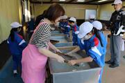 公開研究発表会の来校者を3年生の代表がお迎えし、教室に案内する様子。