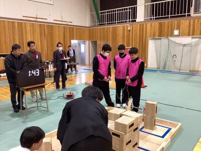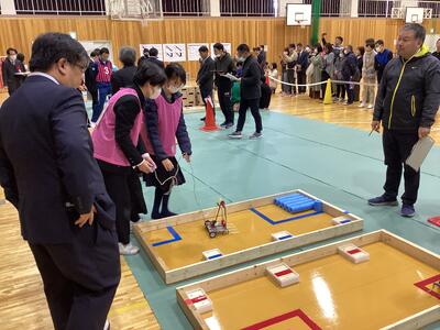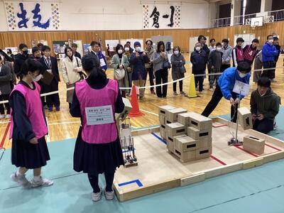 22日(土)、福井県中学生創造ものづくり教育フェアの創造アイデアロボットコンテストが県立科学技術高校の体育館で開催されました。
