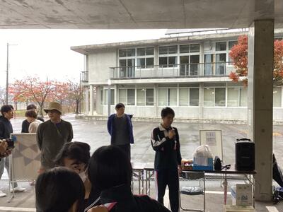 マルシェのスタート、まちづくり委員の山田君が挨拶。