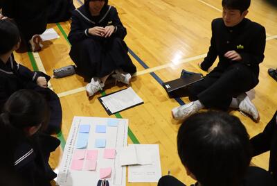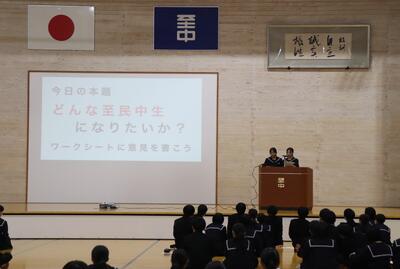 第2部では、「どんな中学生になりたいか」についてクラスターセッションを行い、話を進めました。クラスターごとの縦割りグループで付箋を使いながら話し合い、多くの意見が出されていました。各クラスターの代表発表では、それぞれのクラスターの副クラスター長が意見を吸い上げ、発表班を決めていました。発表された意見では、「まわりを見て行動できる至民中生」や「挨拶がしっかりできる至民中生」など多くの意見が出ました。これらの意見を中央委委員で整理して、2学期生徒会が中心となって取り組む活動を考えていく予定です。