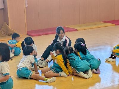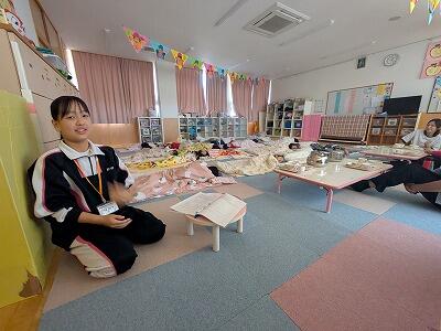 小さい子のクラスではお昼寝の時間でした。その他のクラスでは、椅子を並べたり、絵本を読んであげたりと、先生方のサポートをしていました。子どもと手をつないで歩いたり、優しいまなざしで見守ったりする姿がとても微笑ましかったです。
