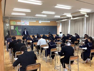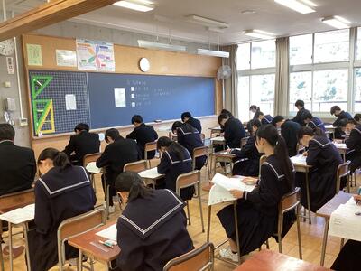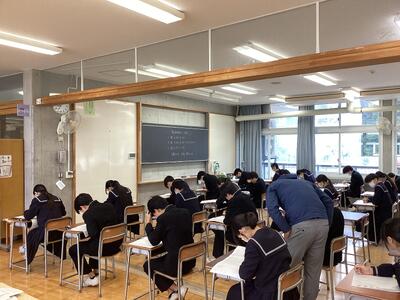 🏫学力診断テスト 投稿: 管理者 (08:46) カテゴリー: 今日の出来事 本日、明日と3年生は学力診断テストです。1,2年生は同時刻に確認テストをしています。 今朝は、今年一番の冷え込みでしたが、生徒たちはそれにひるむことなく、テストに向かっていました。 どの教室も、集中して問題に取り組む様子が見られました。 今までの努力の成果をしっかりと出し、自分の進路実現に向けて進んでいってほしいと思います。 Tweet -