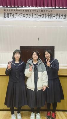 31日(土)創造アイディアロボットコンテスト全国中学生大会に、チーム「妖精さんとゆかいな仲間たち」田端心菜(3-2) 岩永さくら(2-1) 山本詩真(2-2)の3名が出場しました。