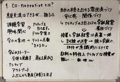 「Co-narrative」とは一体何なのか。子どもたちが自らの言葉で学びを語り出し、互いの物語を編み合わせるためには、どのような授業や学級経営が必要なのか。学年や教科の枠を超え、ホワイトボードが意見で埋め尽くされるほど熱い議論が交わされました。